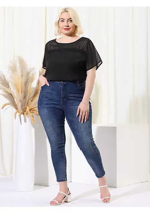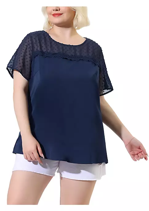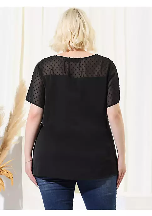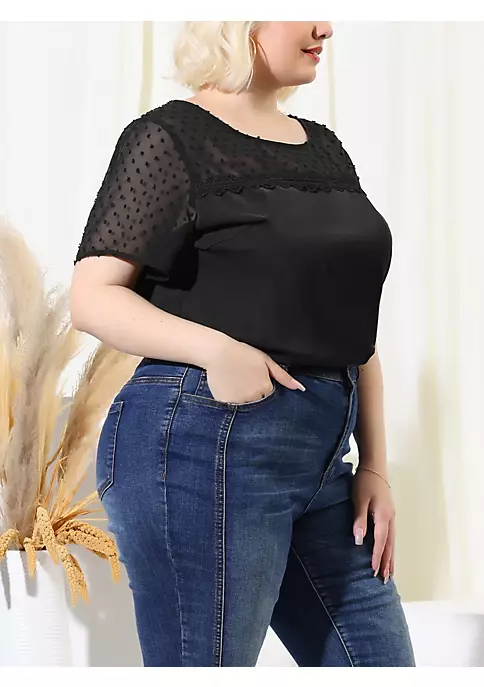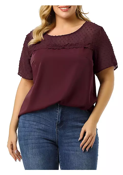 Agnes Orinda Plus Size for Women Belted Waisted Blouse, Polka Dots Lace Long Sleeve Tops