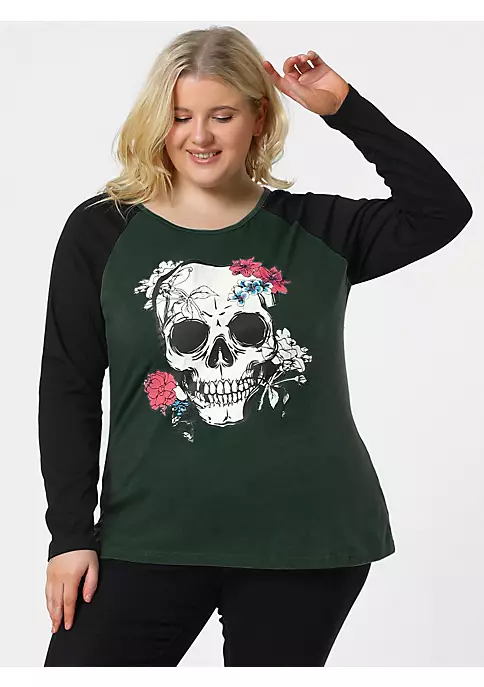 The Agnes Orinda’s knit top features a round neckline, contrast raglan sleeves, and floral and skull graphic on the front.
