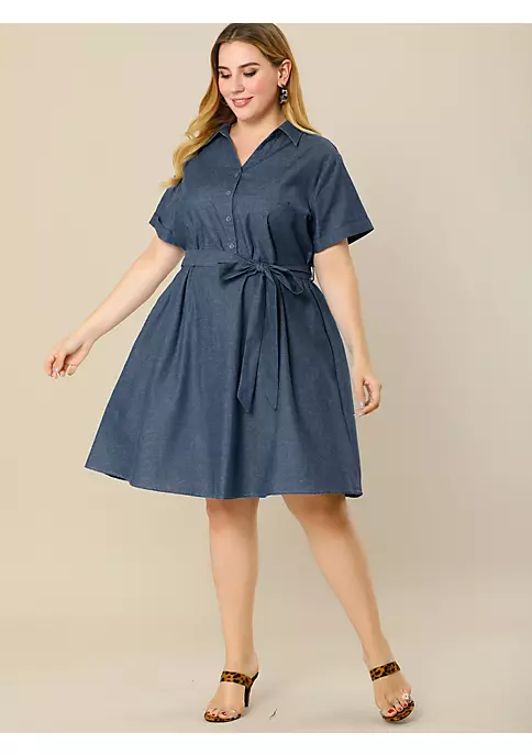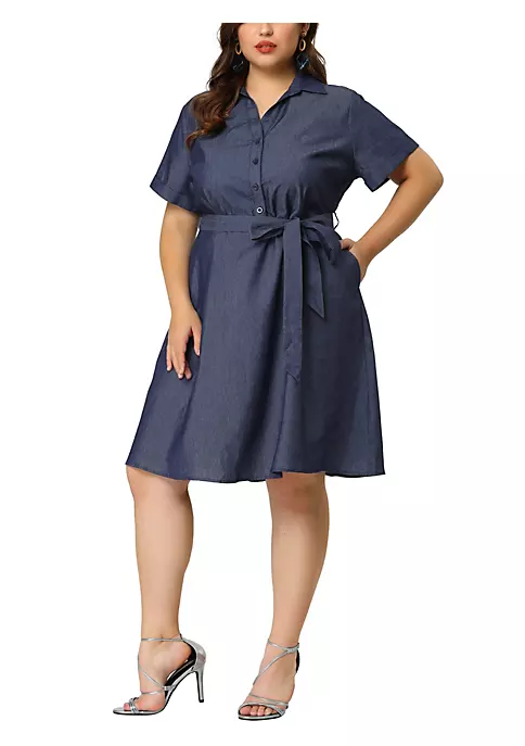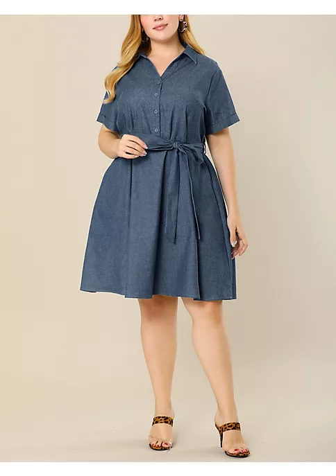 Agnes Orinda Women’s Plus Size 3/4 Sleeve Belted Above Knee Flared Chambray Denim Shirt Dress