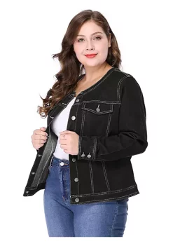 Agnes Orinda Women’s Plus Size Long Sleeves Collarless Denim Jackets with Double Chest Pockets