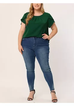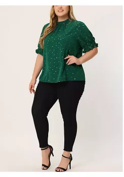 Agnes Orinda Plus Size Tops for Women Work Office Round Neck Pleated Tulip Sleeves Blouse